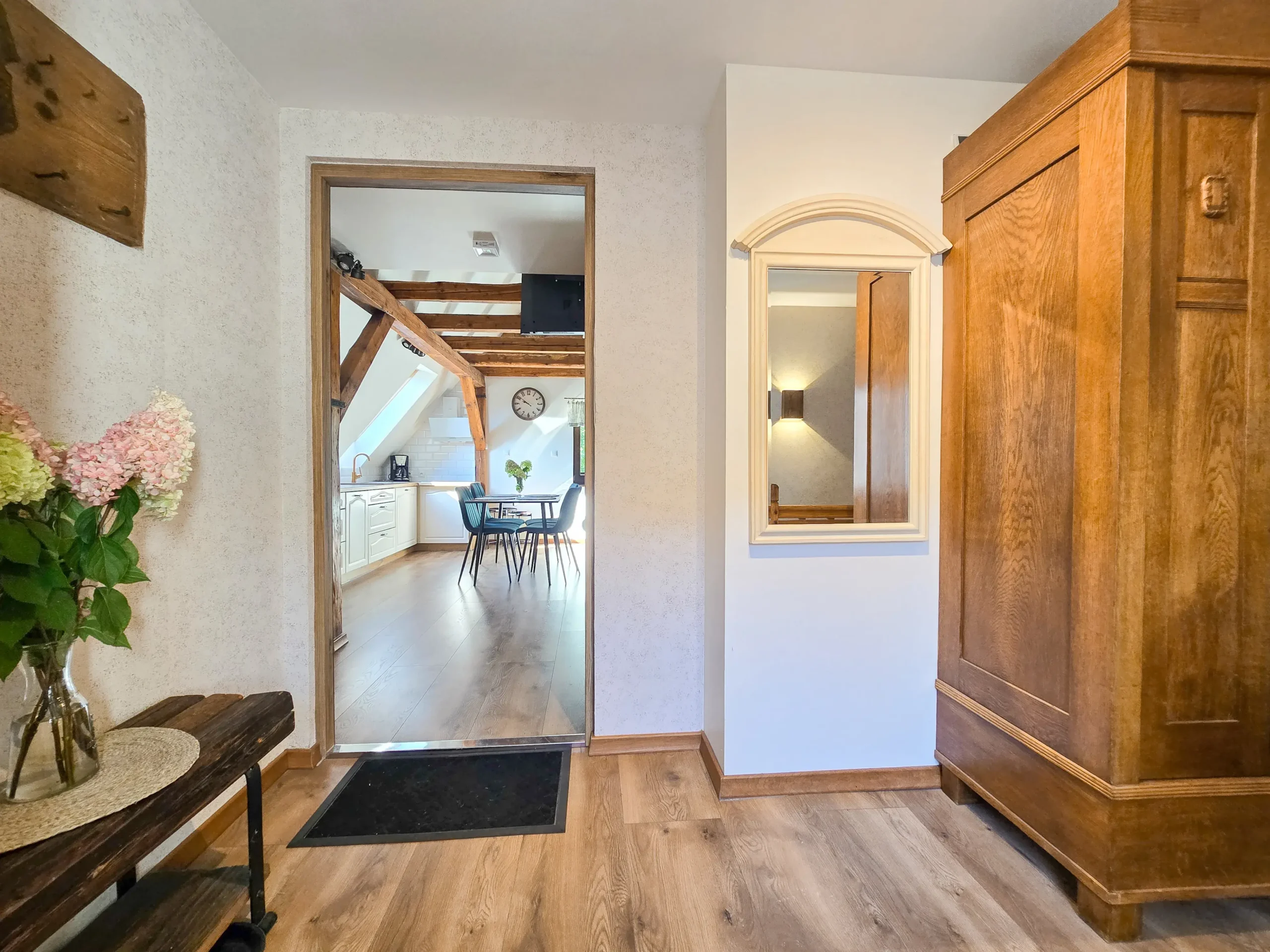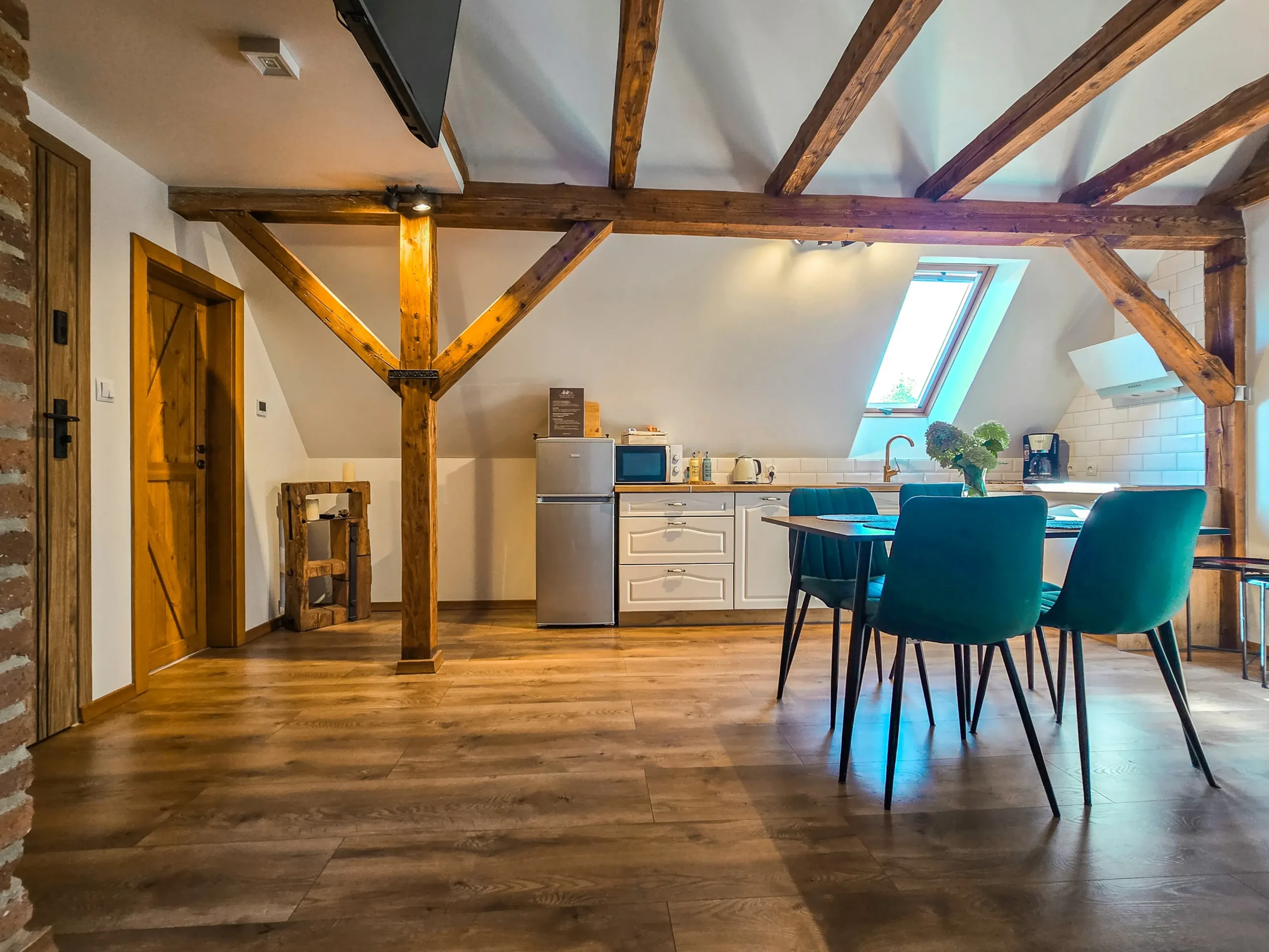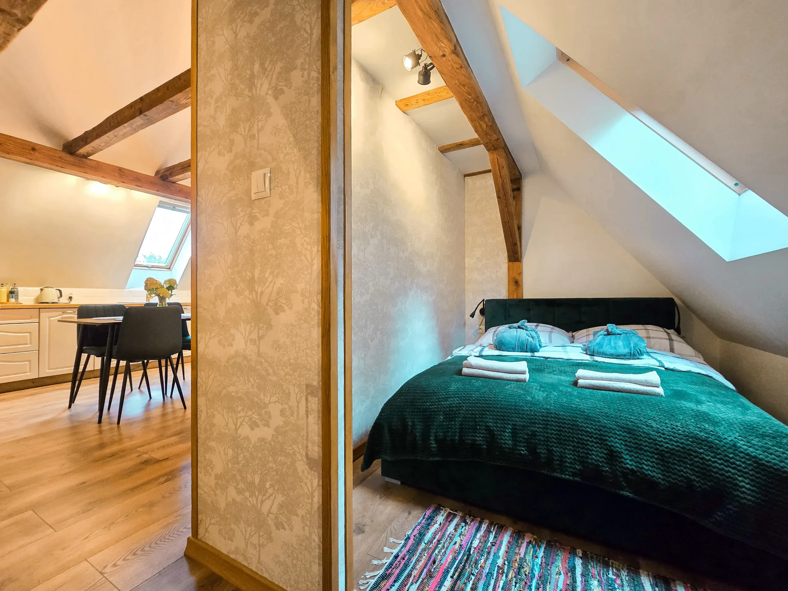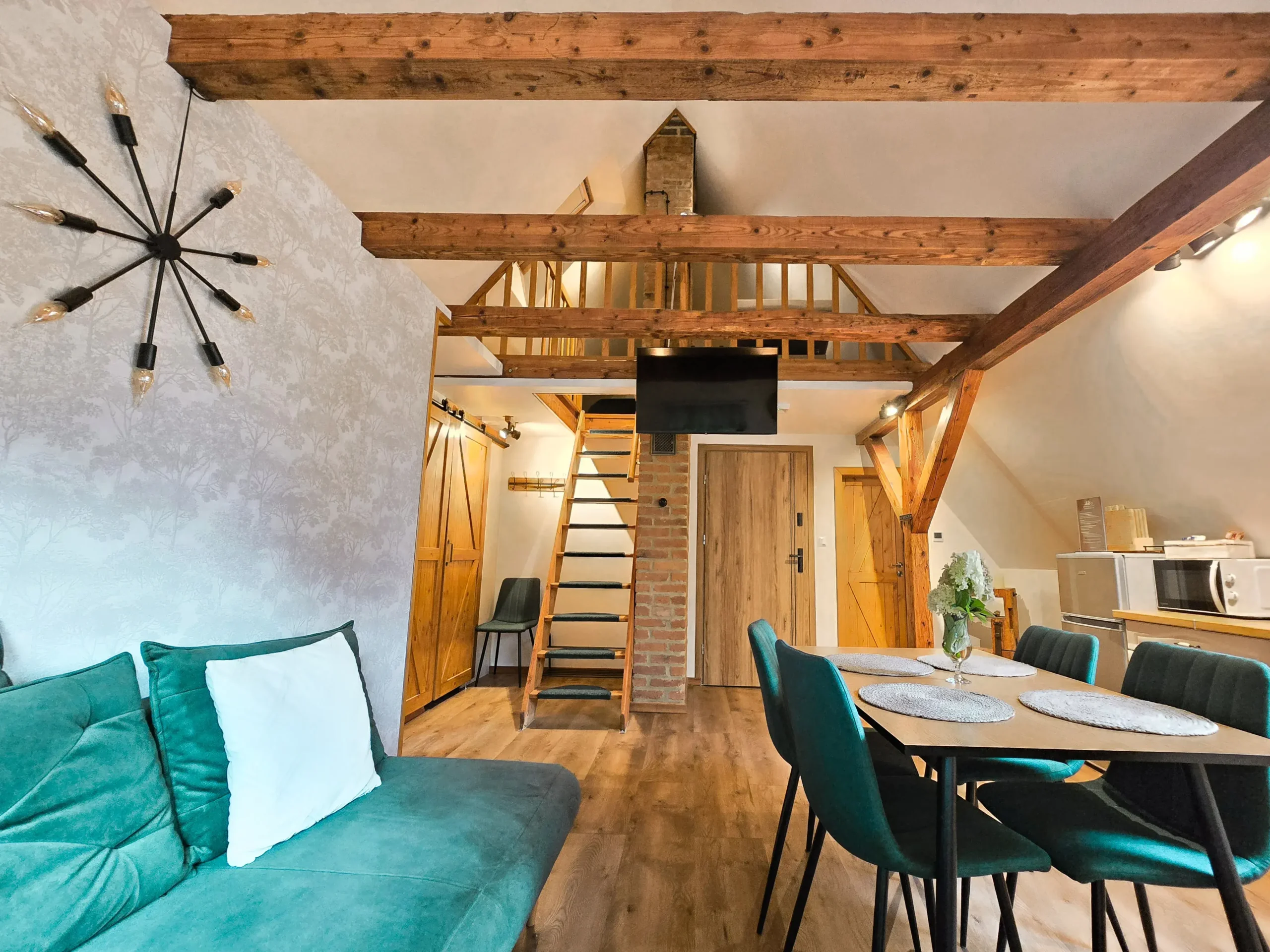 Niezwykle przyjazny oraz komfortowy apartament znajdujący się na pierwszym piętrze stuletniego domu. W środku znajdą Państwo wszystko co niezbędne do komfortowego wypoczynku. Sekcja dzienna oferuje pokaźny narożnik idealny do wypoczynku. W sekcji dziennej znajduje się również w pełni zagospodarowana kuchnia z m.in. lodówką, ekspresem do kawy, czajnikiem elektrycznym. Dla Państwa dyspozycji jest również strefa jadalna, idealna aby zjeść rodzinny, wspólny posiłek lub popracować. W apartamencie znajdują się dwie sypialnie, z czego jedna na antresoli z łóżkiem dwuosobowym oraz jednoosobowym. Zaś druga z łóżkiem dwuosobowym. Wszystkie łóżka posiadają niezwykle wygodne materace. Do apartamentu przynależy altana z murowanym grillem.