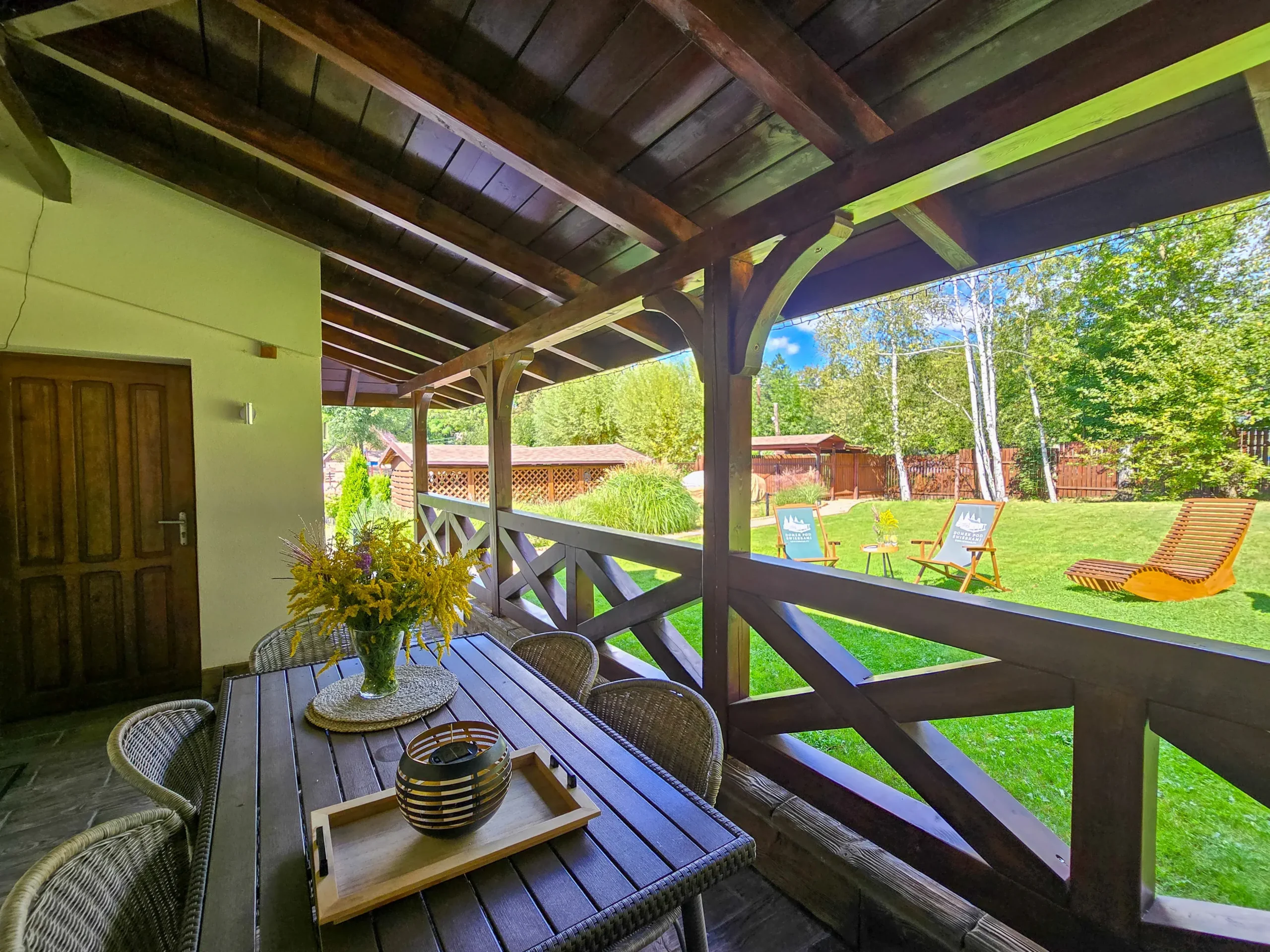 Domek znajdujący się w otoczeniu pięknych, starych świerków z dużym tarasem z widokiem na ogród. Jego powierzchnia to 55m2, może pomieścić 5 osób. Sekcja dzienna oferuje pokaźny narożnik, idealny do wypoczynku. W sekcji dziennej znajduje się również w pełni zagospodarowana kuchnia z m.in. lodówką, ekspresem do kawy, czajnikiem elektrycznym. W domku znajdują się dwie sypialnie. Jedna z nich mieszcząca się na parterze posiada łóżko podwójne oraz pojedyncze. Druga sypialnia- na piętrze posiada podwójne łóżko z własną toaletą i umywalką. Łazienka z kabiną prysznicową oraz toaletą jest na parterze domku. Do domku przynależy murowany grill.